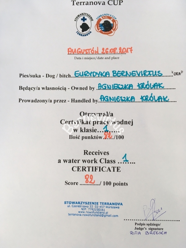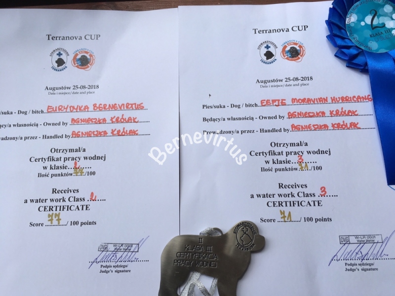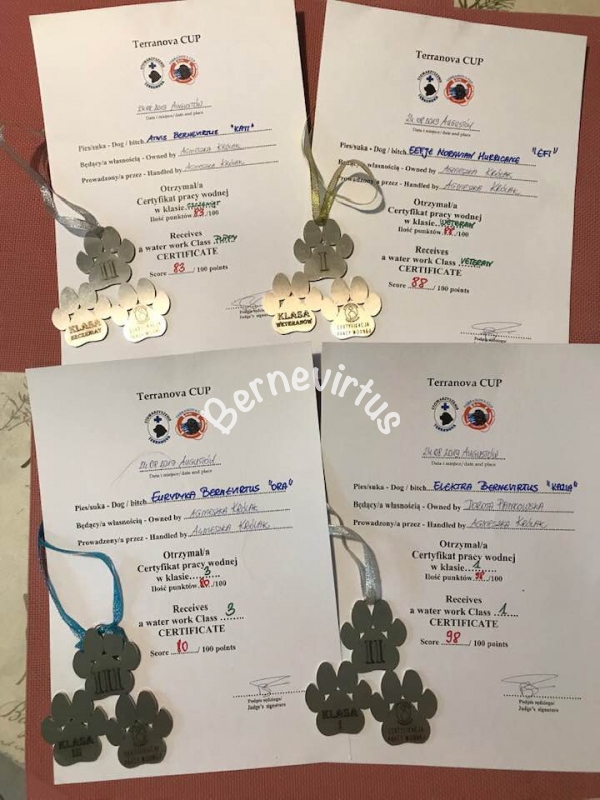 Sukcesy bernevirtus! Certyfikacja pracy wodnej (praca wodna z elementami ratownictwa wodnego). Cztery psy, cztery klasy i cztery medale certyfikacji pracy wodnej psów: I, 2 x II i III miejsce ( Electra Bernevirtus vel Kazia, Eefje Moravian Hurricane vel Efi, Eurydyka Bernevirtus vel Ora i moja malutka "wschodząca gwiazda" Atnis Bernevirtus vel Kati), sędzia międzynarodowy Bernard Pouvesle FCI (Francja).