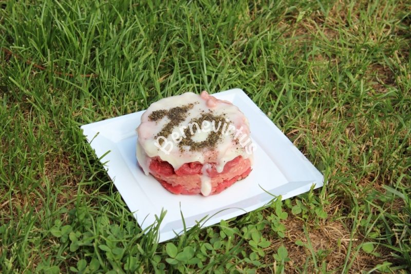 Dziś radosny dzień: Sabunia świętuje 10 urodziny! Zdrowa, jak zawsze radosna i pogodna, przyrządzono pyszny tort przyrządzony z surowej wołowiny i indyka, z dodatkiem smalcu z kaczki.