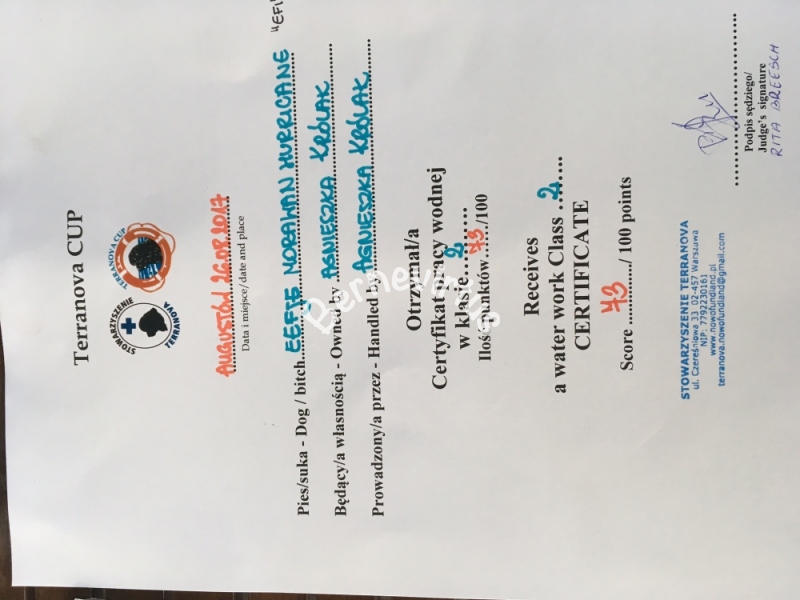 Sierpień był dla nas bardzo ciekawy i pracowity. Las, jezioro, plenery mazurskie i certyfikacja pracy wodnej organizowana przez stowarzyszenie Terranova. Efi uzyskała certyfikat zpracy wodnej klasa I doskonałą punktacją (92/100) i zdobyła w klasyfikacji drugie miejsce. Cudnie sprawdza się jako pies pracujący w wodzie. A wraz z Efi jej córki: Ora i Kazia - początkujące doskonałe wodniaczki!